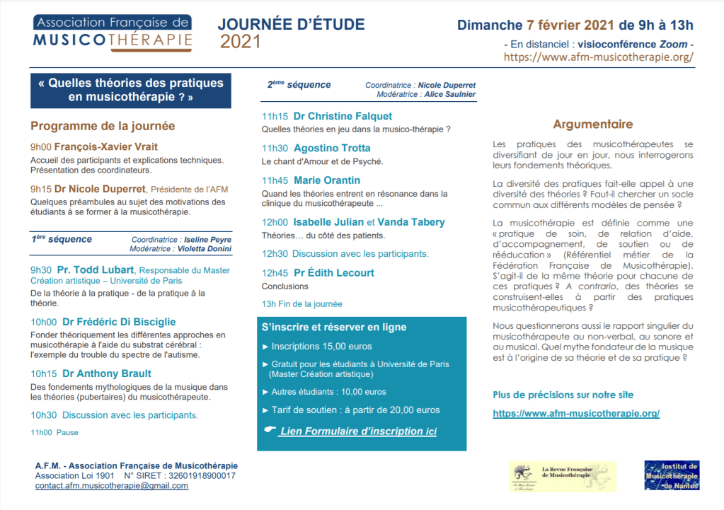 L’Association Française de Musicothérapie organise une journée d’étude en visioconférence (Zoom) le dimanche 7 février 2021 de 9h à 13h. Le thème ? « Quelles théories des pratiques en musicothérapie ? »