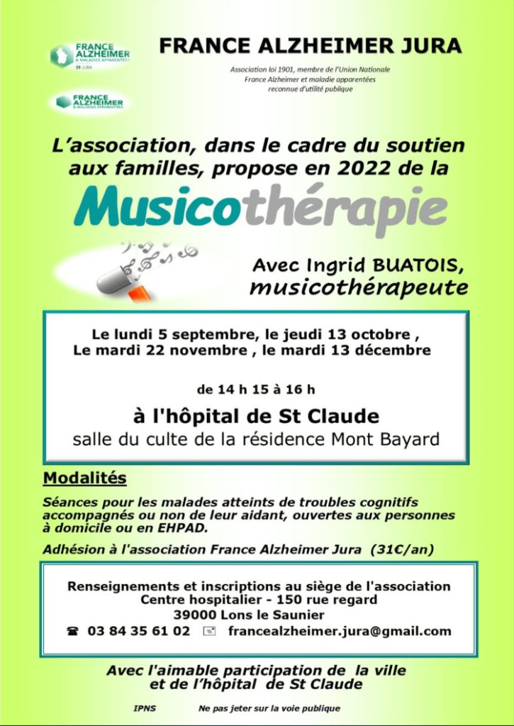 France Alzheimer Jura propose en cette rentrée un cycle de 4 séances de musicothérapie aux malades atteints de troubles cognitifs accompagnés ou non de leurs aidants.