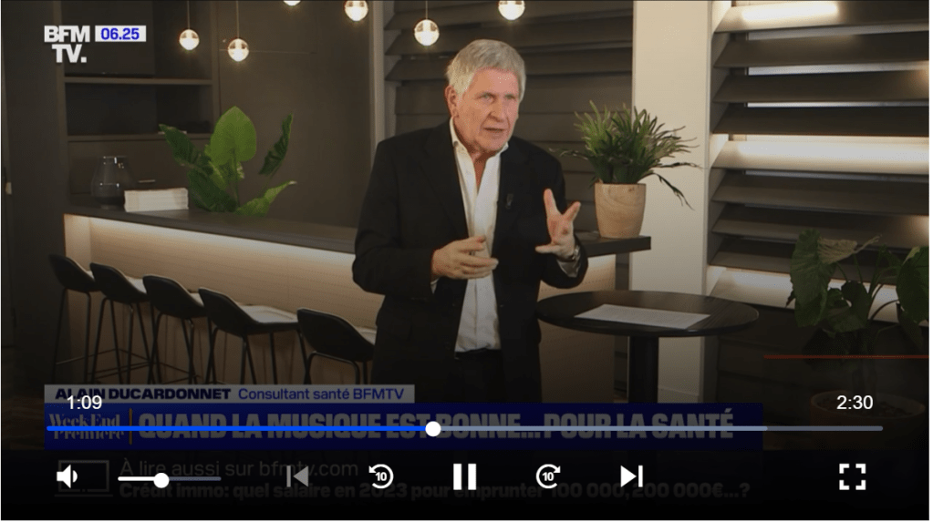 Dans cette courte vidéo généraliste diffusée le 1er janvier dernier sur BFM.TV., le Dr Alain Ducardonnet évoque l’intérêt de la musique pour réduire la douleur et l’anxiété ou encore favoriser le maintien des capacités mnésiques, notamment pour les patients atteints d’Alzheimer.